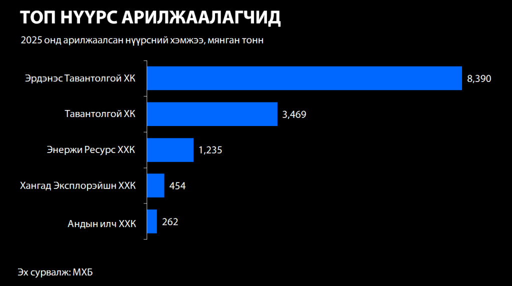 2025 оны нүүрсний нийт арилжаа 14 сая тонн хүрснээс дийлэнхийг “Эрдэнэс Тавантолгой” компанийн 8.4 сая тонн нүүрсний арилжаа бүрдүүлж байна. “Тавантолгой” болон “Энержи Ресурс” компани 3.5 болон 1.2 сая тонныг тус тус арилжаалснаар араас нь бичигдэж байгаа юм.